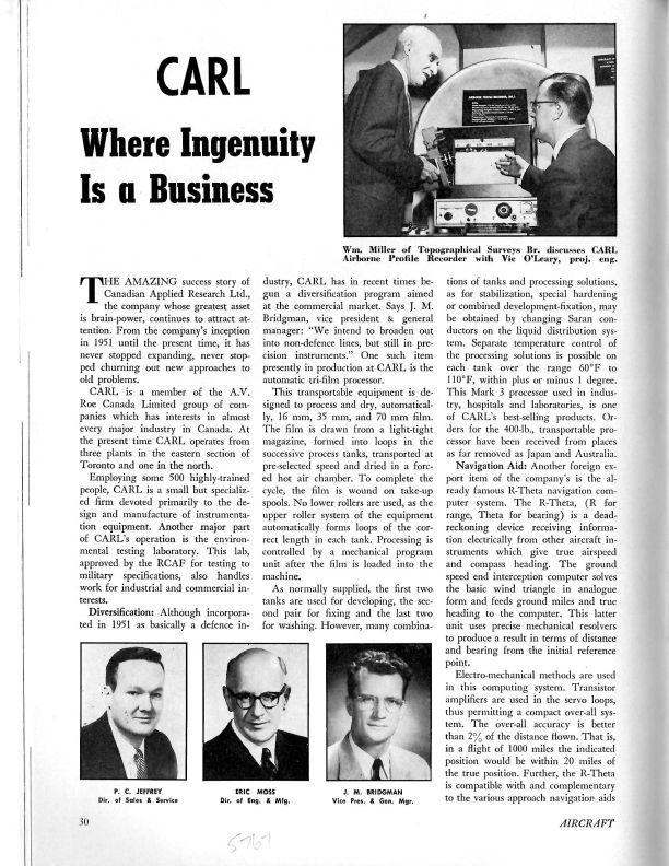 pg 30, 33, 35, 36 - Magazine article reports on the history and scope of A.V. Roe Canada Ltd. subsidiary Canadian Applied Research Ltd., which was devoted primarily to the design and manufacture of instrumentation equipment. Included are photographs of J.M. Bridgeman, Vice President & General Manager, P.C. Jeffrey, Director of Sales & Service, Eric Moss, Director of Engineering & Manufacturing, and Vic O'Leary, Project Engineer. R-Theta navigation computer system; Type T232 Mk. 8 aerial camera.Publication Details