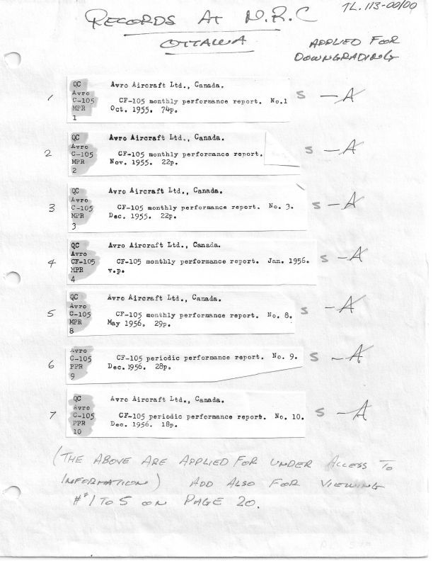 Catalogue of documents at NRC applied for downgrading under Access to Information topics include the Avro Arrow