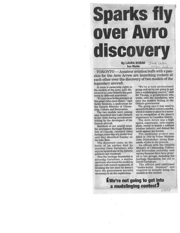 Newspaper article reporting disputed ownership rights to two Arrow models discovered in Lake Ontario.Publication Details