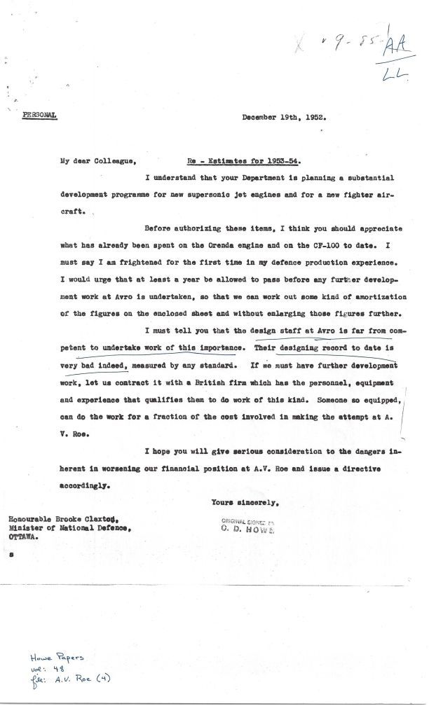 CD Howe expresses serious concern about AVRO's ability to design the CF-105 based on their CF-100 track record. He states that the design staff is far from competent, and their record is very bad.