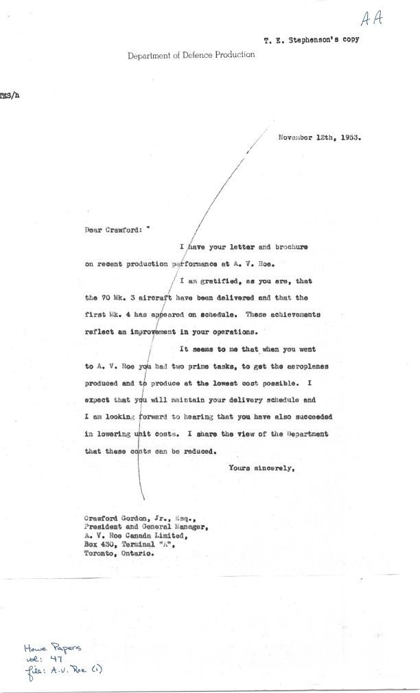 CD Howe letter to C Gordon RE: 70 Mk 3 CF-100's delivered and first Mk. 4 on schedule