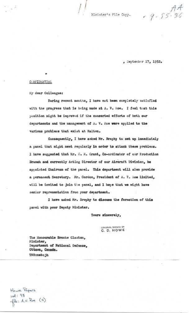 Letters between Cabinet Ministers CD Howe and Brooke Claxton regarding concerns about AVRO progress, and the path to remedy it.