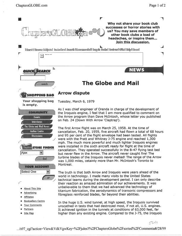 Letter from Orenda engineer responding to a letter published in the Globe and Mail that misrepresented the Arrow project. Pratt and Whitney J-75 engine; B-47 Orenda engine test; Iroquois turbine blades; titanium fabrication; wind tunnel tests covered - reprinted from websitePublication Details