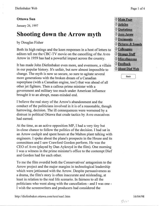 Newspaper article by former MP Douglas Fisher defending the cancellation of the Arrow project. Several unsuccessful major government projects are cited, including Pickering airport, Spadina Expressway, Mirabel airport, Canada Car's Bobcat, Pearson III, N.S. heavy water plant, Airbus. - Via Diefenbaker WebPublication Details