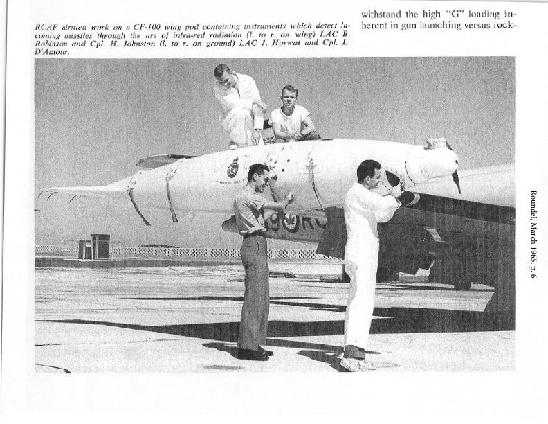 CF-100 image showing wing pod containing instruments which detect incoming missiles through the use of infra-red radiation & image of Velvet glove