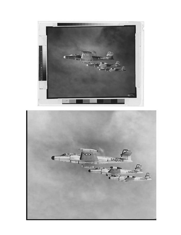 CF-100 Negative image, with corresponding positive of three A/C (326, 332, 335) flying in formation