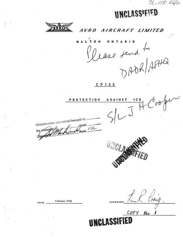Description plus Drawings of CF-105 Ice Protection Systems; Detailed Description of Anti-Ice systems for Radome. Engine Intakes and Pilot Windscreen. Wing anti-ice not needed.