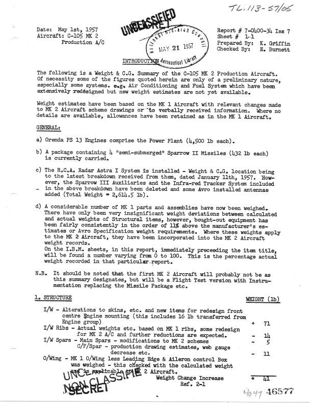 Cf-105 Weight and Balance Summary Per Issue 7 for Mark 2 Aircraft
