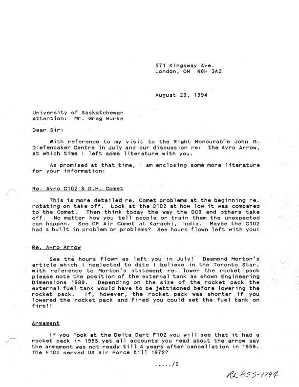 Chas J. Wacey to Greg Burke - Jetliner/Arrow - Diefenbaker Canada Centre