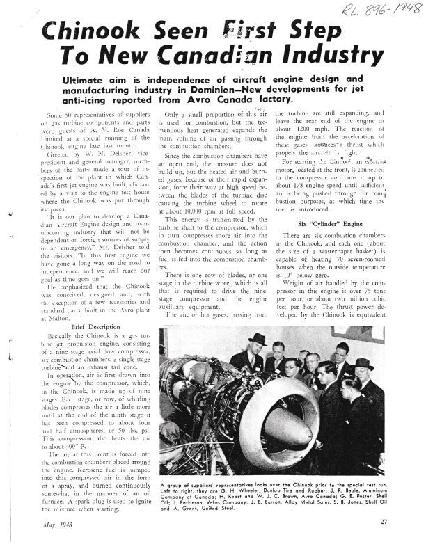 Chinook engine described - 27, 28. Photo shows group of suppliers' reps with the Chinook. Names include W.N. Deisher, G.H. Wheeler from Dunlop Tire and Rubber; J.R. Beale from Aluminum Company of Canada (ALCAN), H. Keast & W.J.C. Brown from Avro Canada, G.E. Foster, Shell Oil, J. Parkinson from Vokes Company, J.B. Barron from Alloy Metal Sales, S.B. Jones from Shell Oil and A. Grant from United Steel.Publication Details
