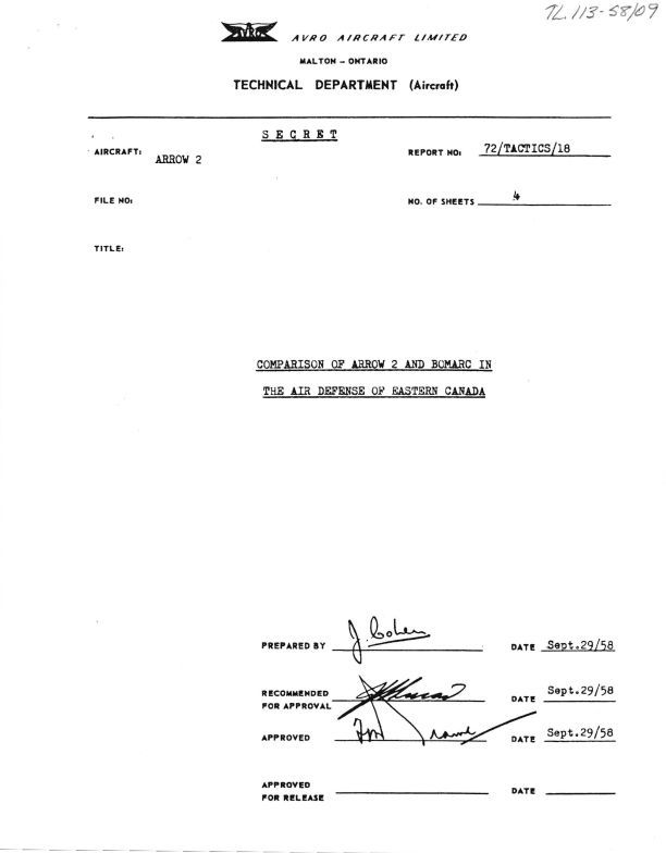 Comparison of Arrow 2 and BOMARC in the Air Defence of Eastern Canada; Comparison Charts of Arrow 2 Aircraft and BOMar in the Air Defence of Eastern Canada-Arrow 2 for superior. Report approved by F. Brame