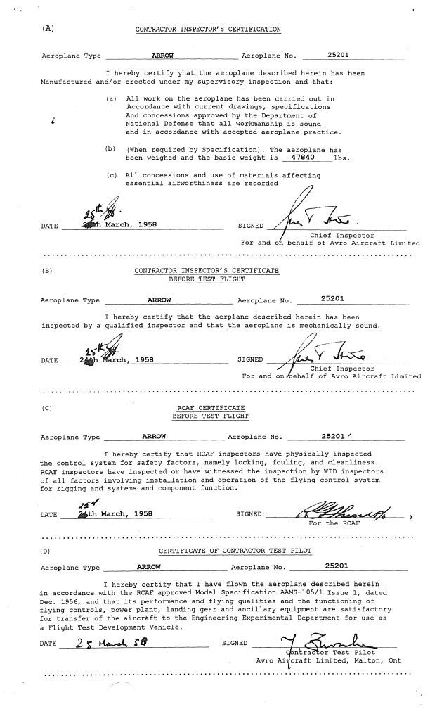 Contractor's Inspection Certificates For CF-105 Aeroplane No. 25201
