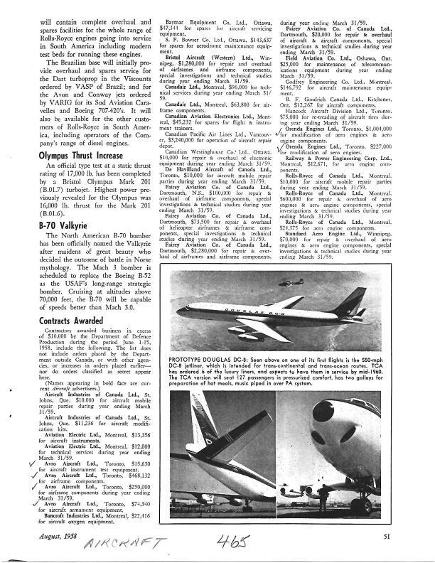 Page 51 Avro Aircraft Ltd. were awarded 4 contracts by the Department of Defence Production: 1. $15,630 for aircraft instrument test equipment, 2. $468,132 for airframe components, 3. $250,000 for airframe components, 4. $74,340 for aircraft armament equipment. In addition Orenda Engines Ltd. were awarded 2 contracts: 1.$1,004,000 for modification of aero engines and components, 2.$227,000 for modification of aero engines.Publication Details
