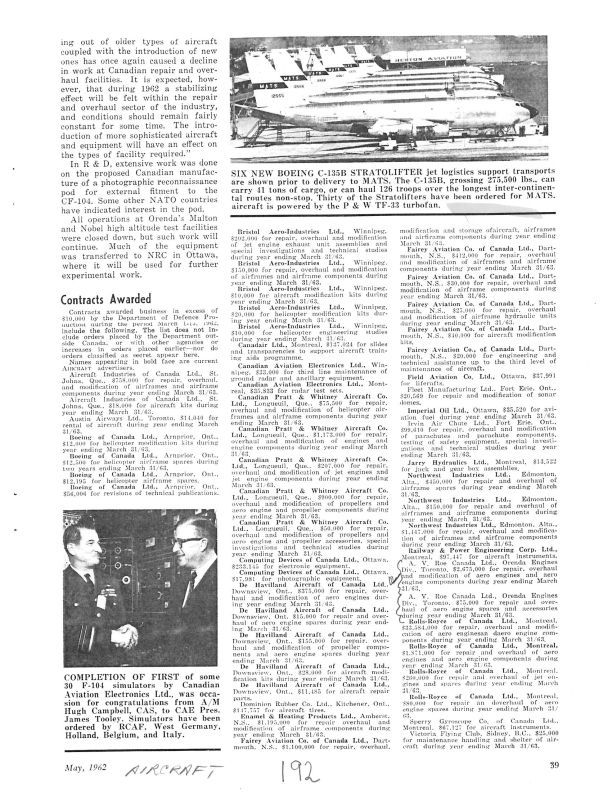 Page 39 A.V. Roe Canada Ltd. Orenda Engines Division was awarded 2 contracts by Department of Defence Production in the amounts of $2,675,000 for repair, overhaul and modifications of aero engines and aero engine components and $75,000 fo repair and overhaul of aero engine spares and accessories for year ending Mar 31 1963.General Notes