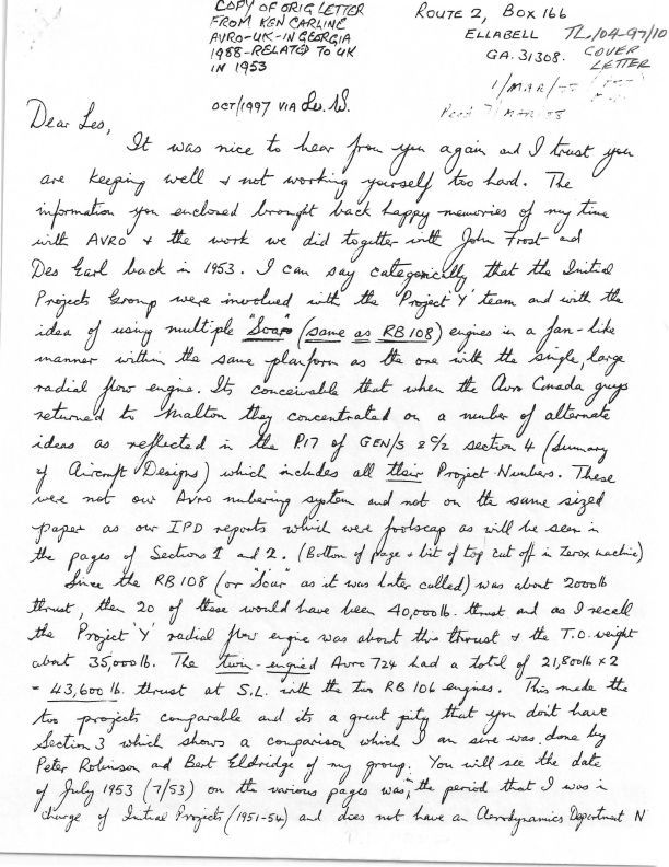 includes Project 'Y' and VZ-9V Avrocar. Second letter discussing and comparing thrust of a variety of engines on the Avro 720, 724 etc. Names include Thomas Desmond (Des) Earl, Bert Eldridge, John Carver Meadows Frost, Peter Robinson, Peter Sutcliffe.