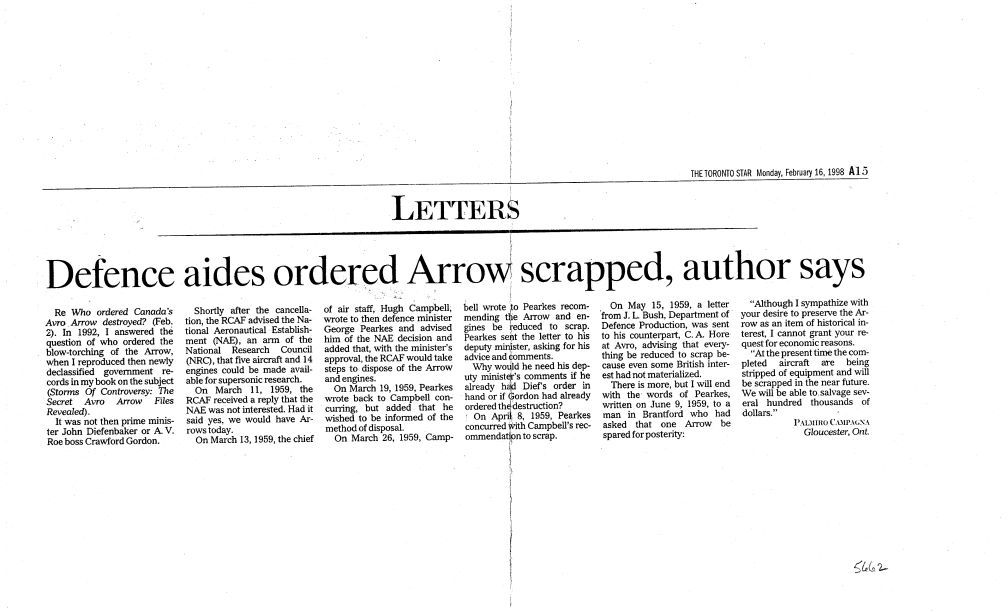 Letter to newspaper from Palmiro Campagna quoting records showing that the destruction of the Arrow aircraft and engines was recommended by the Chief of Air Staff and approved by the Minister of Defence.