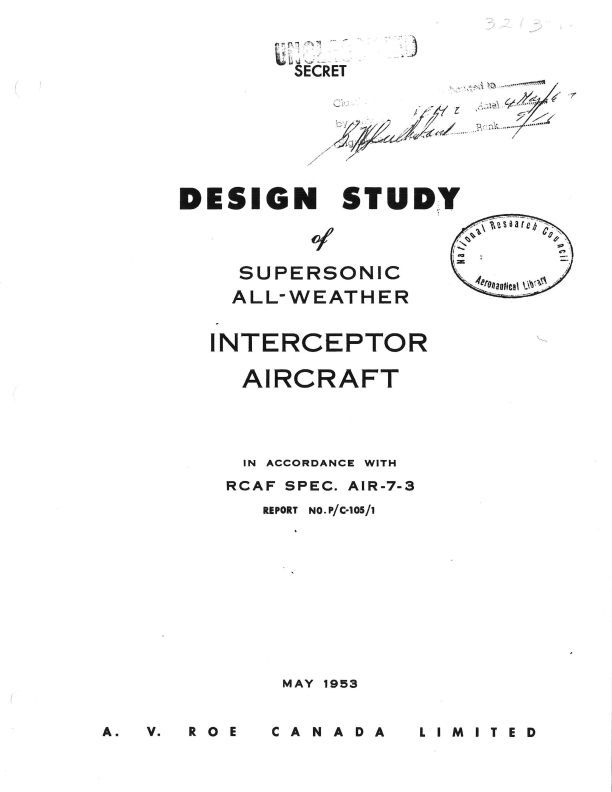 Study in accordance with RCAF Spec. AIR 7-3; Report no. P/C-105/1; discussing basic configuration, undercarriage, engine installation, armament, radome and cockpit, camber; (C-105) see also 3214