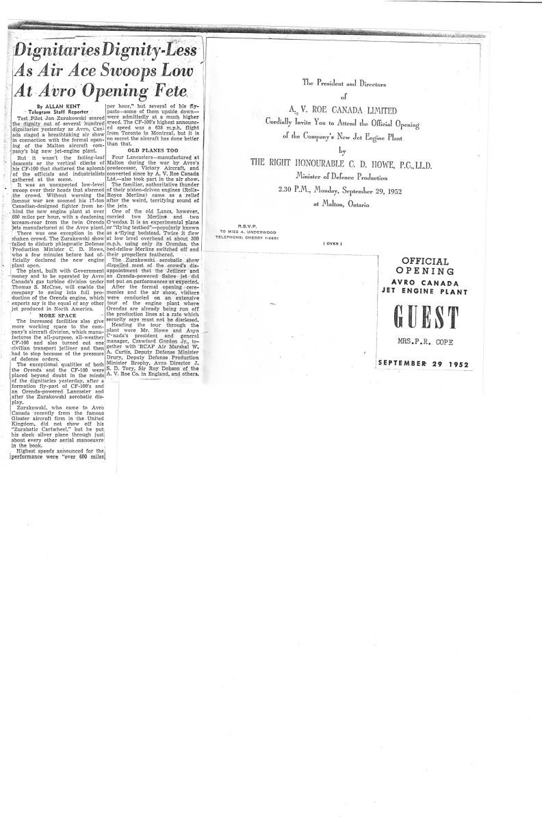 Zura scares the guests at the new Orenda shop open house, CF-100's and Lancs at Avro. A copy of Mrs. Peter Cope's invitation to the show.General Notes