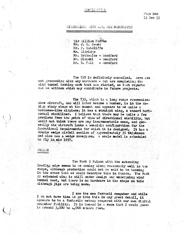 Memo outlining authors visits throughout the UK. Discusses the 720 being cancelled, 730 long range reconnaiseance aircraft, Mark 2 Vulcan, etcGeneral Notes