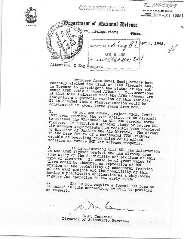 expression of interest by Canadian Navy in potential of the AvroCar for shipborn duty 3 Apr,1958 - NSC 7801-103 (DSS)