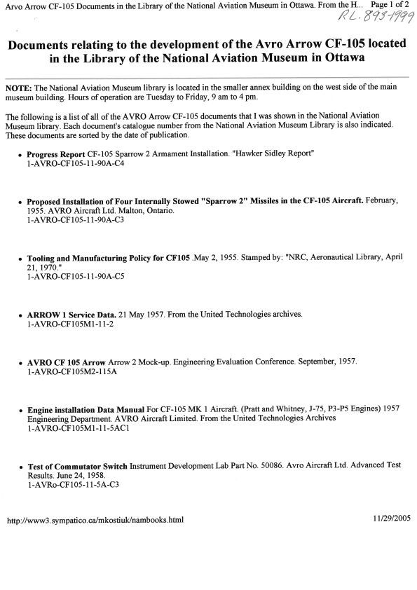 List of documents at the National Aviation Museum in Ottawa related to the Arrow