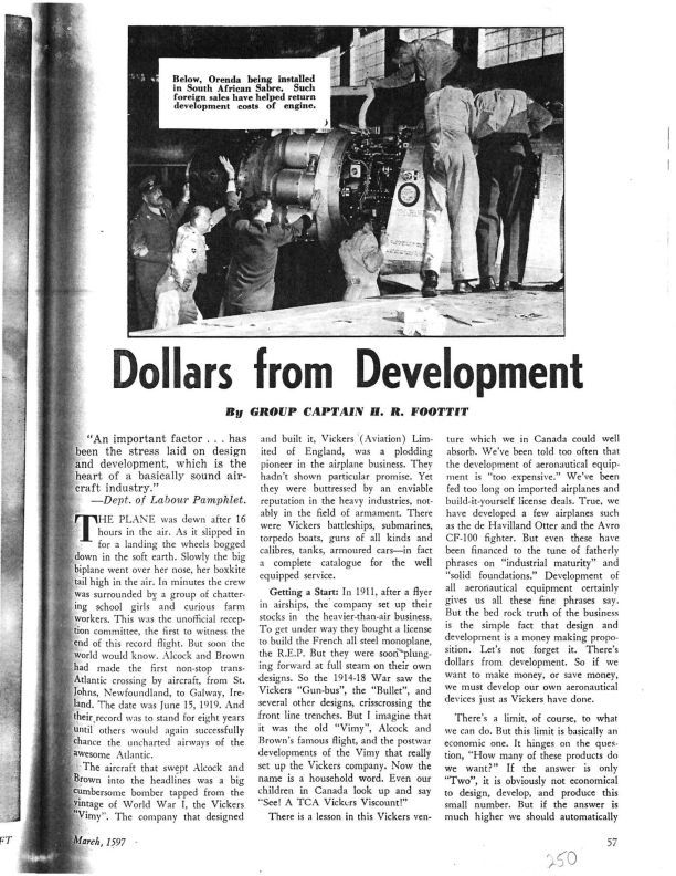 pg 57-60, 108-109 includes image of Orenda engine being insalled into a South African Sabre and a CF-100 in flight. Story includes quote that it was likely cheaper to build the CF-100 with Orenda engine than it would have paid to purchase products from the US or UK.Publication Details