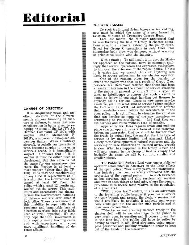 pg. 58 - Change of Direction - editorial lamenting government's ineptitude in retiring the CF-100 Canuck. Reference to the reversal of strategy that required the cancellation of the Arrow.General Notes