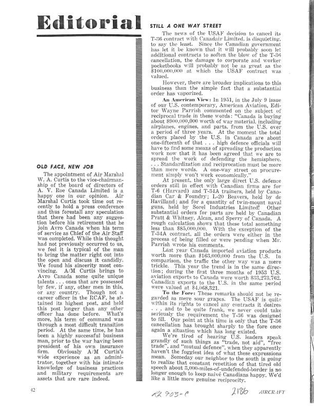 Pg 42 Old Face, New Job - appointment of Air Marshal W.A. Curtis to the vice-chairmanship of the board of directors of A.V. Roe Canada LimitedGeneral Notes