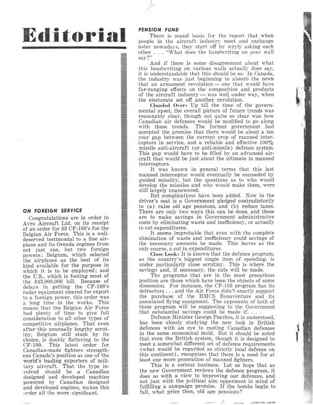 pg 130 - On Foreign Service - Avro Aircraft Limited receives order for 53 CF-100's for the Belgium Air Force. Pension Fund - highlights the precarious positon of the CF-105.General Notes