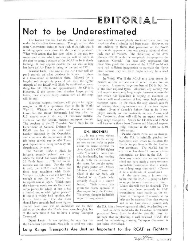 pg 42 Oh Brother - Defence Minister Claxton and A/M Curtis name the CF-100 the Canuck, and get criticism for not being imaginative. Not to be underestimated - discusses Korean War and potential need of 150 CF-100's.Publication Details