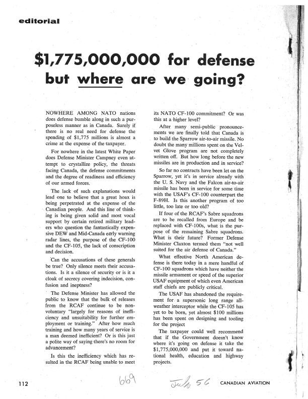 pg 112 $1,775,000,000 for defense but where are we going? Discusses DEW & Mid-Canada early warning radar lines, CF-100 and CF-105 plus Velvet Glove and Flalcon missilesPublication Details
