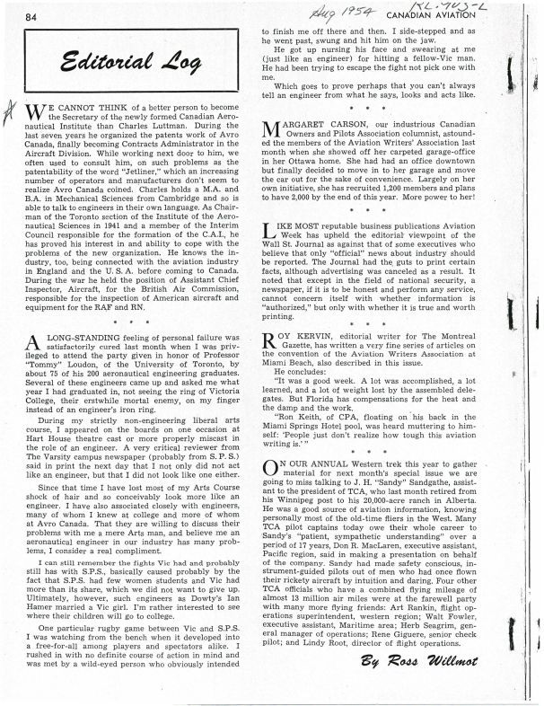 pg 84 - Charles Luttman, worked in Patents at Avro finally becoming Contracts Administrator in the Aircraft Division - becomes the secretary of the newly formed Canadian Aeronautical InsitutePublication Details