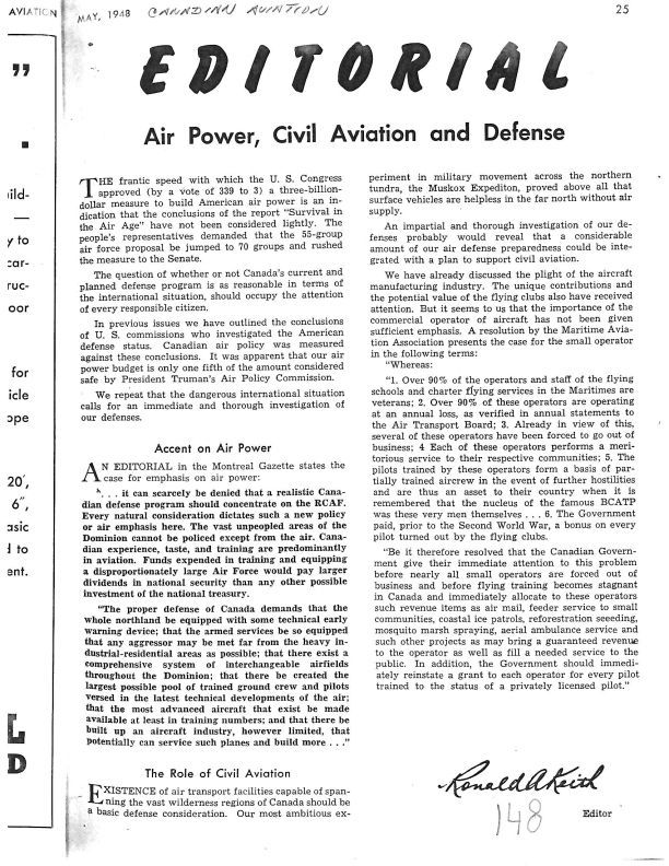 pg 25 Air Power, Civil Aviation and Defense - editorial proposing the government provide revenue items such as air mail. Spraying etc. to keep them solvent.Publication Details