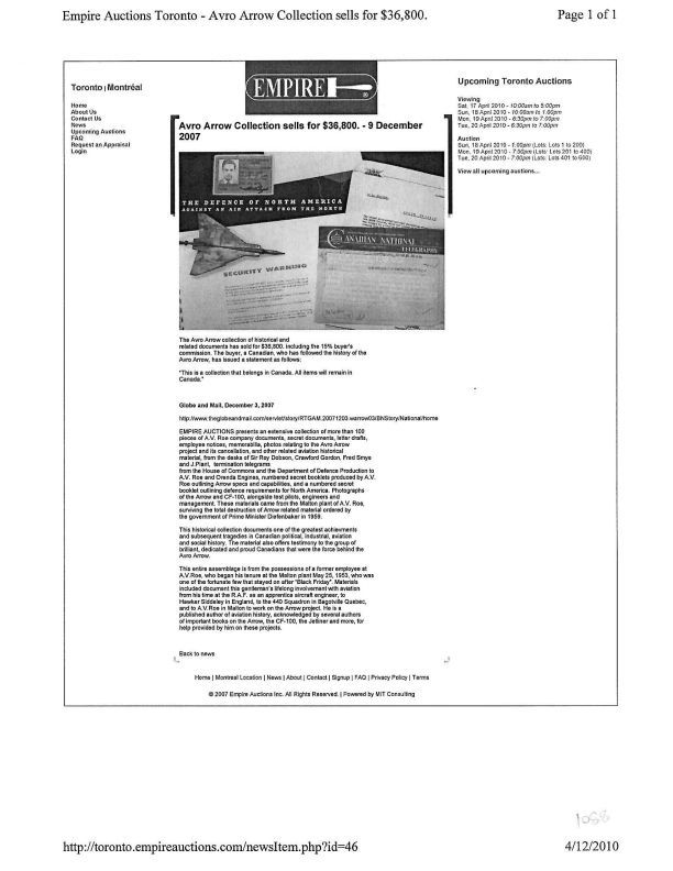 Empire Auctions Toronto - Avro Arrow Collections sells for $36,000