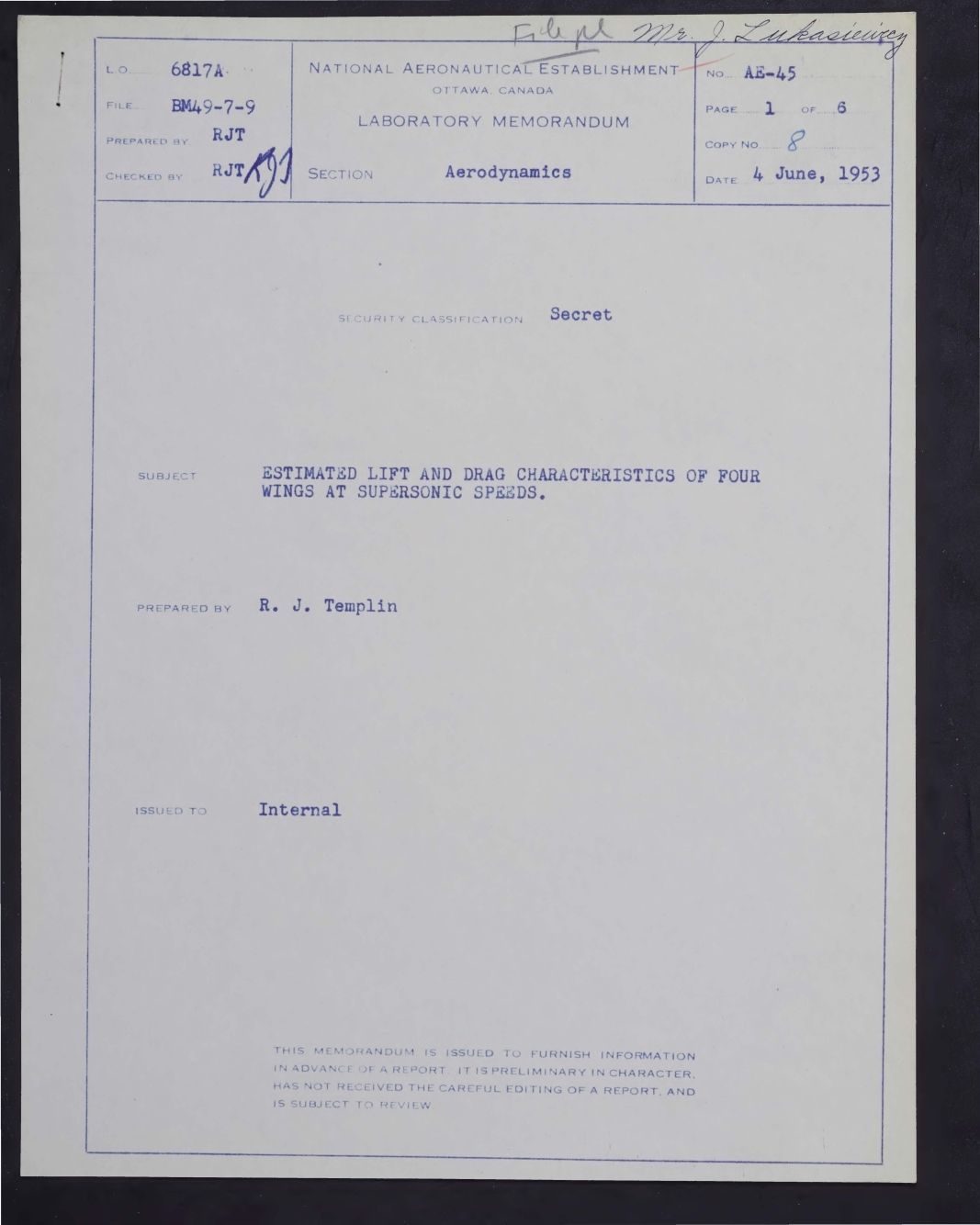 Empirical methods of estimating the lift and drag characteristics of untwisted and uncambered wings at supersonic speeds have been developed in the Aerodynamics Laboratory. These methods are applied in the present note to the estimation of the characteristics of four wings at present undergoing force tests in the 10-inch supersonic tunnel.