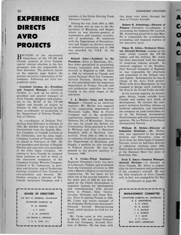 pages 30,31, 68,70 - highlights key personnel at Avro and includes photos. Names include Ronald "Ron" Adey, Robert D.(Bob) Armstrong, Edgar H. Atkin, Earle (Earl) K. Brownridge, K.R. Church, Z. S. Cyma, Walter Nice Deisher, William H. (Bill) Dickie, Paul B. Dilworth, Roy Hardy Dobson, James "Jim" Charles Floyd, Crawford (Jr.) Gordon, L. E. Marchant, T. S. McRae, J.A. Morley, M. G. Nix, W. Parish, Donald "Don" Howard Rogers, Frederick "Fred" Thomas Smye, T. O.M. Sopwith, Sir Frank S. Spriggs, J. F. Taylor, John S.D. Tory, J. Turner, Dennis E. Wiseman, Janusz "Jan" Zurakowski.Publication Details