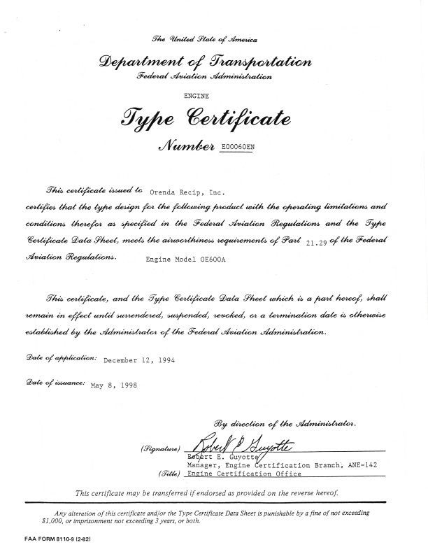 FAA and Transport Canada Type Certificate for Orenda OE600A