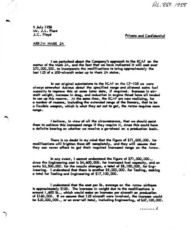 Floyd letter to JL Plant Re: Arrow Mark 2A
