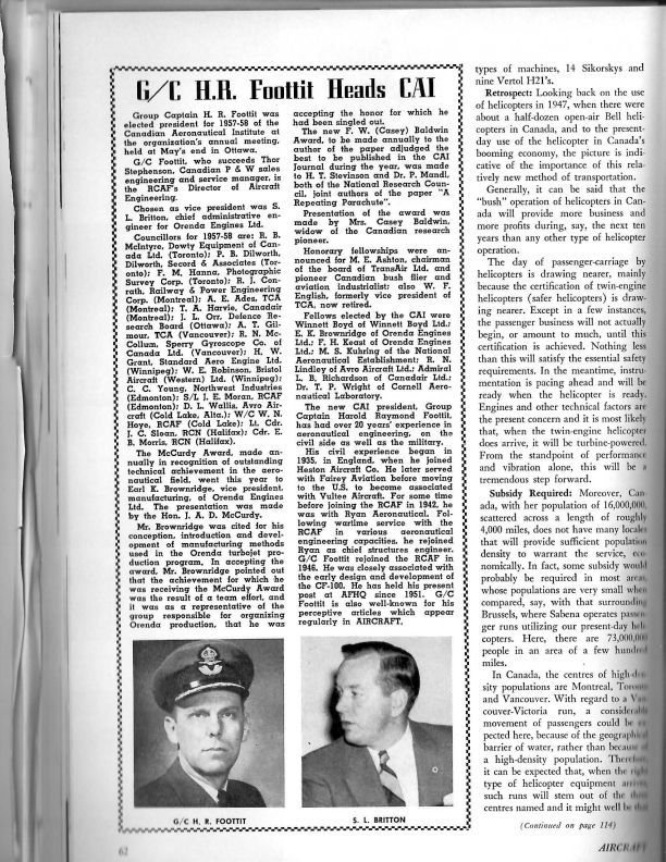 pg 62 Group Captain Harold Raymond Foottit was elected president for 1957-1958 of the Canadian Aeronautical Institute; Foottit was associated with the early design and development of the CF-100. Chosen as VP was S.L. Britton, chief administrative engineer for Orenda Engines Ltd.General Notes