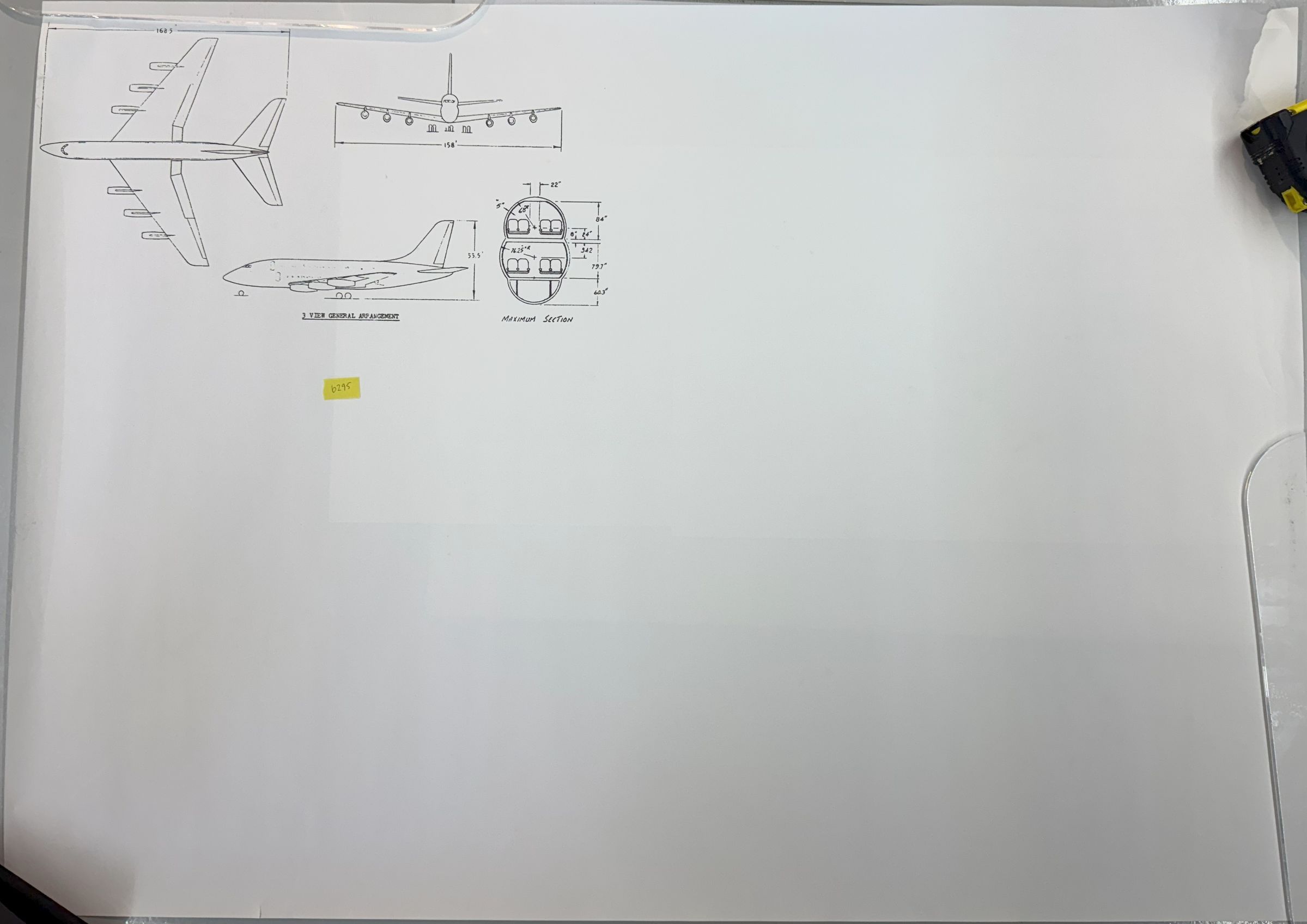 3 view plus section of large passenger jet with 6 engines