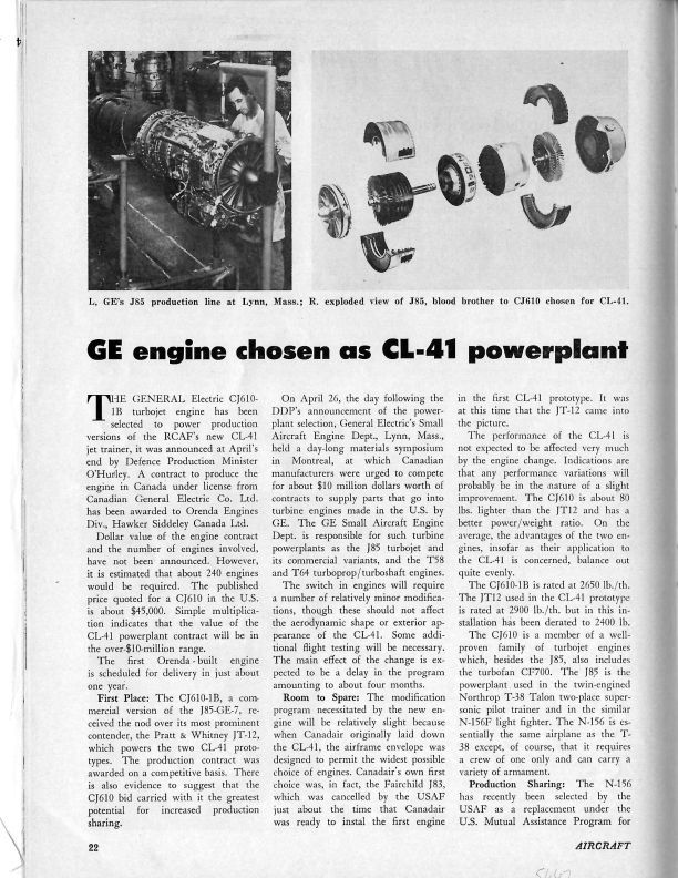 pg. 22 - Magazine article reporting the award of a contract to produce GE CJ610 turbojet engines for RCAF CL-41 jet trainer. J85-GE-7; JT-12 and discusses the project should employee 250 at OrendaGeneral Notes