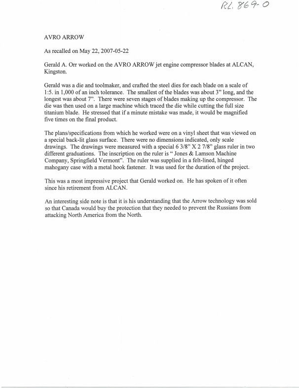 describes how he made Arrow jet engine compressor blades working at ALCAN in Kingston.