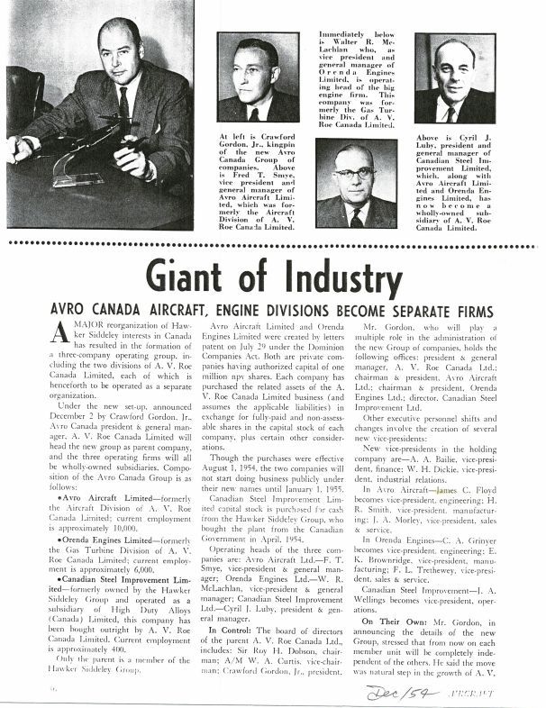 pg 36 - Avro company structure and leadership, reorganizing the divisions into separate companies Dec 2, 1954. F.T. Syme VP and GM Avro Aircraft, W.R. McLachlan, VP & GM Orenda, Sir Roy H. Dobson, Chairman, A/M W.A. Curtis Vice-Chairman, Crawford Gordon, Jr President, A.A. Bailie VP Finance, W.H. Dickie VP Industrial Relations. James C> Floyd VP Engineering, J.A. Morley VP Sales & Service, H.R. Smith VP Manufacturing. For Orenda Engines Limited - C.A. Grinyer VP Engineering, E. K. Brownridge VP Manufacturing, F.L. Trethewey, VP Sales and Service. With photos of Crawford Gordon Jr., Fred T. Smye, Walter R. McLachlan and Cyril J. Luby.General Notes