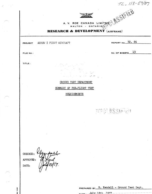 Summary of pre-flight test requirements for the Arrow I First Aircraft. Names include J.D. Hodge, R. Kendall, E.J. Lynes