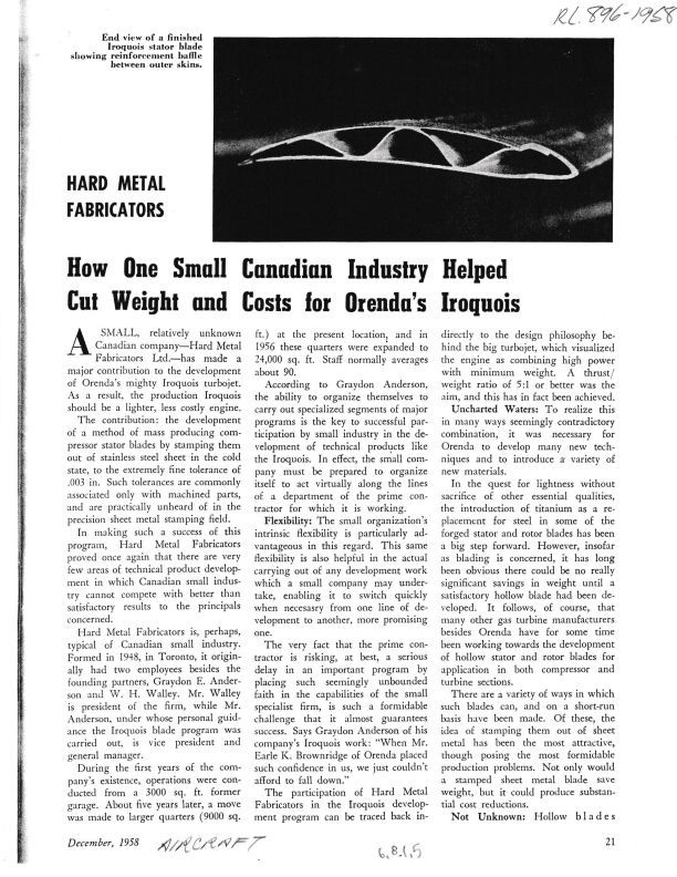 Hard Metal Fabricators - How one small Canadian industry helped cut weight and costs for Orenda's IroquoisEntry/Object ID