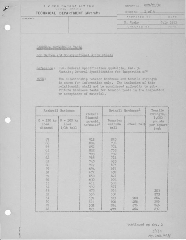 A.V. Roe Canada Ltd. Technical Dept table showing hardness and tensile strength for various carbon and constuctional alloy steels.
