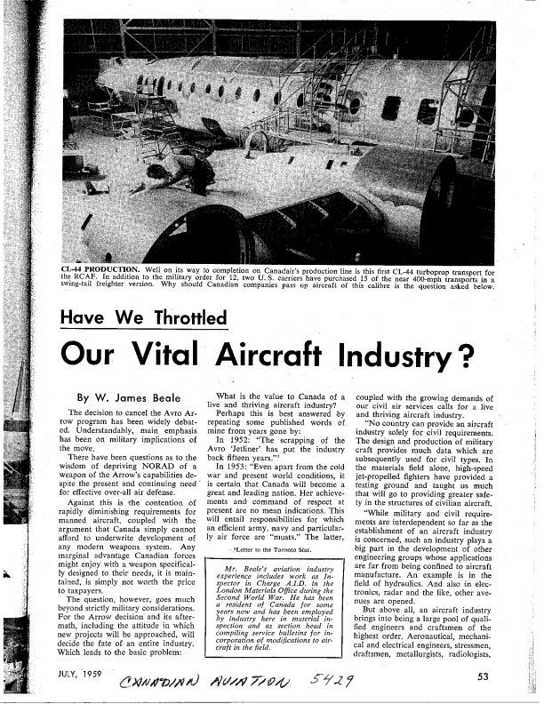 NORAD deprived of Arrow, and statement made in 1952 that the scrapping of the Jetliner put industry back by 15 yearsPublication Details