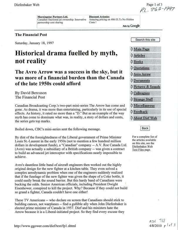Newpaper article stating the CBC dramatization of the Arrow story was factually incorrect, and the project was cancelled due to costs and industry dynamics. - Via Diefenbaker Web