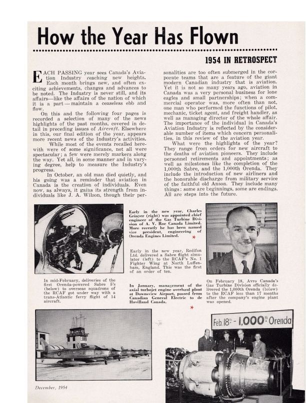 Highlights of the year: Charles Grinyer appointed VP, 1000th Orenda delivered, CF-105 given green light, H. Charles Luttman appointment as secretary of Canadian Aeronautical InstituteGeneral Notes