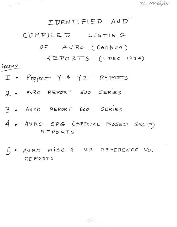 Hand written compilation of various AVRO reports by category. Section 1- Project Y and Y2 reports, Section 2- AVRO Report 500 series, Section 3- AVRO Report 600 series, Section 4-AVRO SPG (Special Project Group) Reports, Section 5-AVRO Misc. and No Reference No. Reports. Very poor quality - photocopies of copies